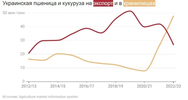 К тому же вывоз пшеницы — это возможность разгрузить заполненные хранилища под новый урожай. По прогнозам, он превысит 53 млн тонн зерновых, что в три раза превосходит нужды украинцев. Однако аналитики ожидают, что в следующем году выйти на довоенный уровень украинский экспорт не сможет, а пшеница и кукуруза продолжат копиться в хранилищах.