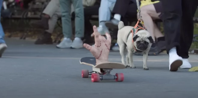 Netflix выпустил новое видео, посвященное сериалу «Уэнсдэй» по вселенной «Семейки Аддамс». В забавном ролике Вещь гуляет по улицам Нью-Йорка и пугает прохожих.