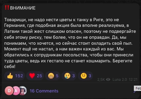 Тем временем на одном из пророссийских Telegram-каналов прозвучали призывы к рижанам больше не оставлять цветы возле танка.