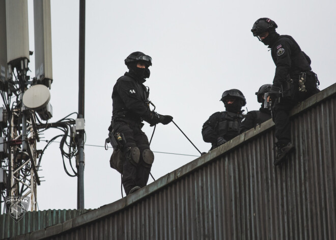 Бойцы спецназа OMEGA на ул. Саркандаугавас, прибывшие на вызов о возможной бомбе.