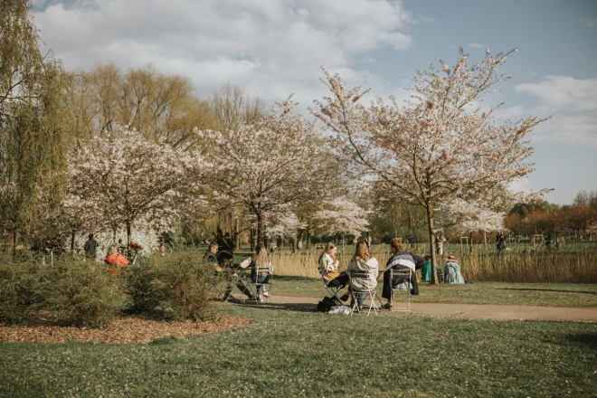 ФОТО: под цветущей сакурой в Пардаугаве устроены места для пикника