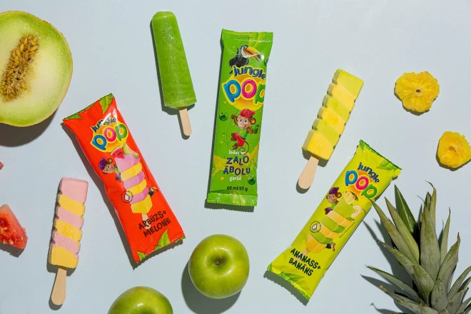 В ассортименте бренда тропического мороженого Jungle Pop появились три новинки на палочке. Приверженцы веганского рациона оценят освежающее мороженое-лед со вкусом яблочного лимонада (60 мл). Впервые в ассортимент Jungle Pop включены два вида молочного мороженого с двойным вкусом: в первом сочетаются зеленоватое ананасовое сливочное мороженое с желтоватым банановым, во втором – розоватое арбузное и нежно-желтое дынное сливочное мороженое (80 мл).