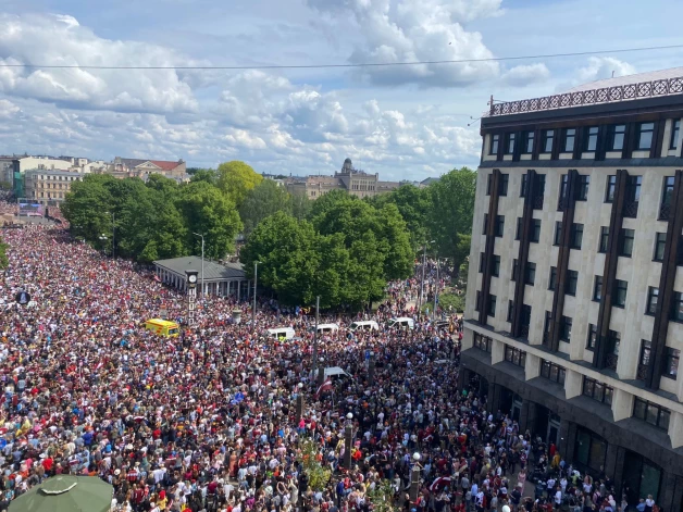 Тысячи людей пришли к памятнику Свободы чествовать сборную Латвии - бронзовых призеров ЧМ-2023 по хоккею