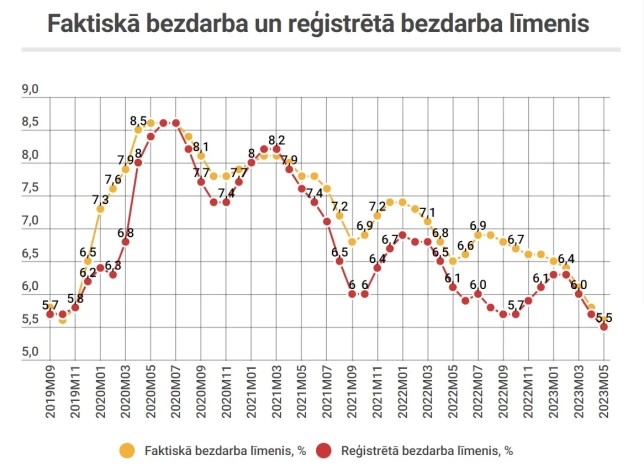 Как отмечает ЦСУ, в то же время уровень безработицы, зарегистрированный Государственным агентством занятости, в мае снизился на 0,2 процентного пункта и составил 5,5% экономически активного населения. По сравнению с маем 2022 года фактическая безработица в Латвии снизилась на 0,6 процентного пункта.
