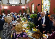 Депутаты собрались в Красном зале за накрытым столом, на котором были выставлены традиционные для этого праздника закуски и напитки - сыр, пирожки, пиво и квас. С поздравительной речью выступил перед собравшимися спикер парламента Эдвард Смилтенс.