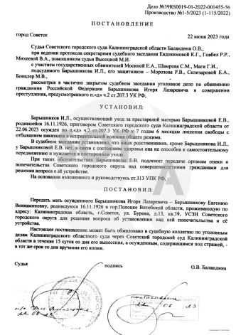 Издание опубликовало постановление суда, в котором говорится, что Барышникова подлежит «передаче органам опеки и попечительства Советского городского округа над совершеннолетними гражданами для решения вопроса о ее устройстве».