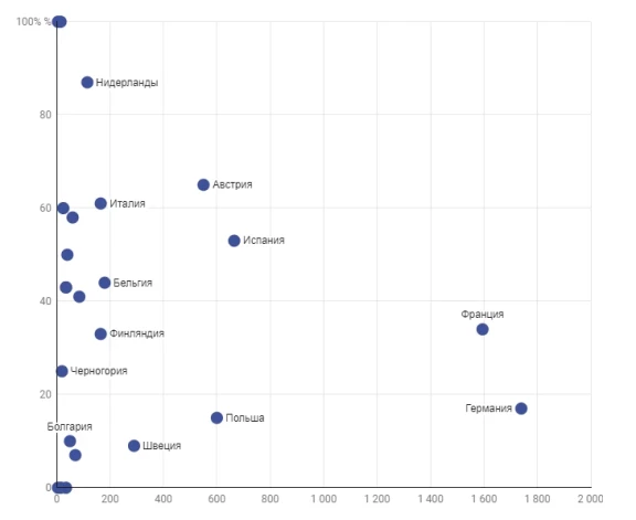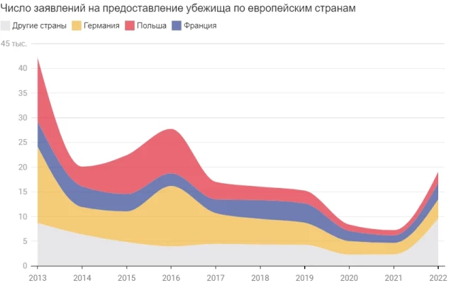 Наибольшее количество вынесенных за год решений в отношении россиян, ищущих убежище, приходится на Францию и Германию. Однако доля одобрений там ниже, чем во многих других государствах Европы. Так, в 2022 году россияне подали 3855 заявлений в Германии и 3350 во Франции. Рассмотрено миграционными службами и судами было всего 1740 и 1595 заявлений. Причем, с учетом срока ожидания, большинство дел, вероятно, относились к прошениям, поданным в 2021-м, а то и 2020 году.