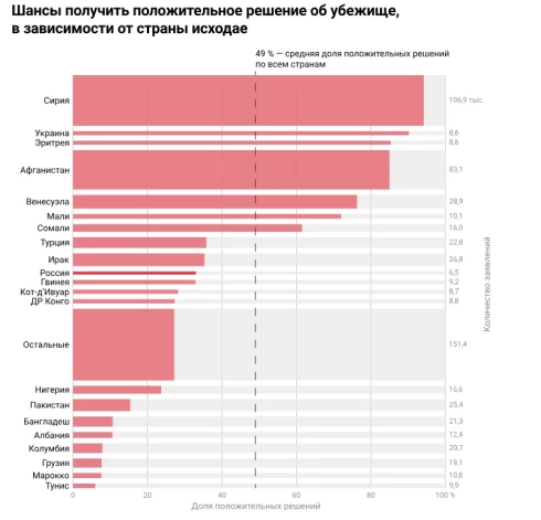 Так, например, превышающая 80% доля положительных решений для граждан Сирии и Афганистана, стран — лидеров по количеству подаваемых заявлений, сильно смещает и общий средний показатель по всем странам. Поэтому Россия с ее только третью одобренных заявлений все равно входит в топ-10 стран с наиболее высокими шансами получить положительное решение о предоставлении убежища в Европе. Тем временем доля россиян в общем количестве тех, кто попросил убежища, невелика — в среднем по странам Европы 1,9%.
