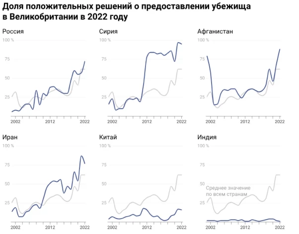 Радушной для россиян, ищущих убежища, оказывается и Великобритания: 72% рассмотренных прошений (195 из 269) в 2022 году закончились положительным решением. Шансы на успех для россиян с 2000 года выросли в четыре раза, но они все еще меньше, чем у граждан Сирии или Афганистана.