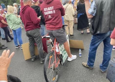 Многие из собравшихся были одеты в красные майки с надписью "Распустить Сейм". У некоторых были с собой латвийские флаги. За порядком следили нанятые партией охранники и полиция.