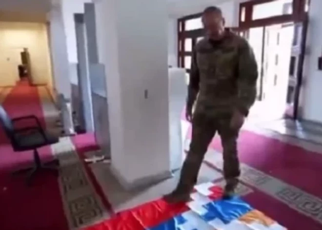 Президент Азербайджана Ильхам Алиев посетил Степанакерт, столицу Нагорного Карабаха, когда-то контролируемую армянской диаспорой, и демонстративно растоптал флаг ныне несуществующей республики в здании горсовета.