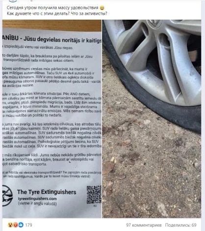 Проживающая в Агенскалнсе автовладелица была крайне раздосадована, когда утром обнаружила, что колеса ее машины спущены. И сделали это не хулиганы, а идейные активисты, оставившие на месте листовку с объяснением своего поступка.
