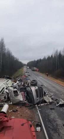 ФОТО, ВИДЕО: лобовое столкновение латвийских грузовиков в Тверской области; оба водителя погибли