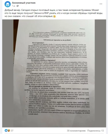 Живущий в Пурвциемсе, на улице Иерикю, рижанин написал в социальной сети, что получил письмо, в котором сообщалось, что в пробах воды, взятых в его доме, обнаружилась вызывающая легионеллез бактерия. Далее на листе бумаги формата А4 была приведена информация о самой болезни и о профилактических мерах. Автора сообщения встревожил тот факт, что, когда он позвонил в домоуправление, там ему ответили, что ничего не слышали ни о каких проверках.