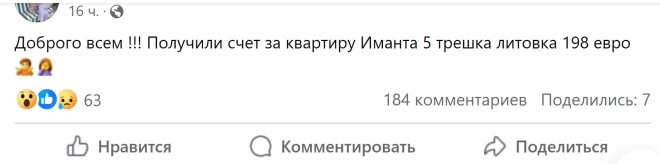 "Так приятно, что уехала... вода 2 лари за 5 кубометров, вся комуналка за месяц, т.е. газ+вода+электричество = 40 лари. Примерно 14 €". [Очевидно, автор комментария переехала в Грузию. - Прим. ред.]