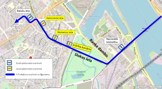 На улице Слокас у троллейбуса будут остановки «Бульвар А. Грина», «Улица Нометню» и «Улица Калнциема». Остановки «Kalnciema iela» (Raņķa dambī) и «Ķīpsala» на маршруте будут закрыты.