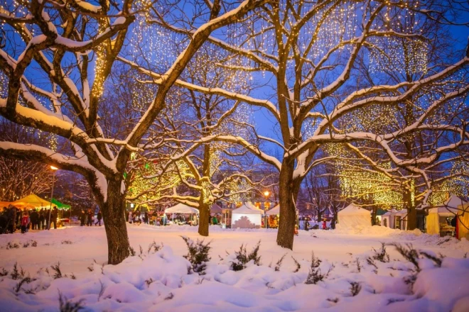 На площади герцога Екаба в кронах деревьев сияют светодиодные световые завесы, а также освещены три арки с мотивами падающих звезд, которые образуют световую аллею.