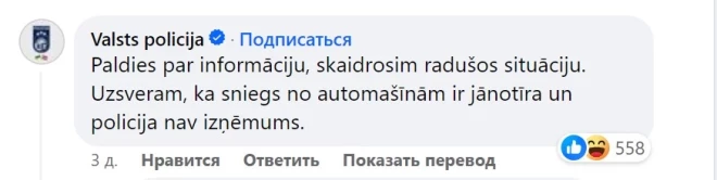 Это видно на снимке, опубликованном в группе Sadursme. В комментариях люди возмущаются такой ситуацией. Позже появился ответ и от полиции; "Спасибо за информацию, будем выяснять ситуацию. Подчеркиваем, что снег с машин надо чистить, и полиция не исключение".