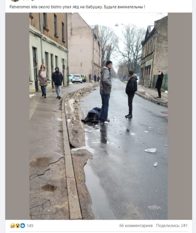 Об этом сообщают рижане в социальных сетях. Вчера в тематической группе появилось сообщение о том, что на улице Патверсмес "лед упал на бабушку". К сообщению была приложена пугающая фотография, на которой несколько человек стоят возле женщины, лежащей на асфальте. Вокруг нее разбросаны разбившиеся ледяные осколки.