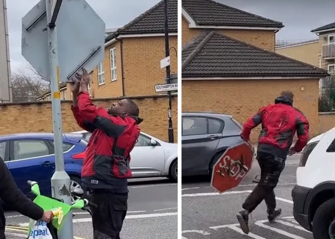 На видео можно услышать, как свидетели говорят "О Боже мой", когда один из мужчин берет знак STOP и убегает. При этом никто из свидетелей не сделал ничего, чтобы остановить преступника.