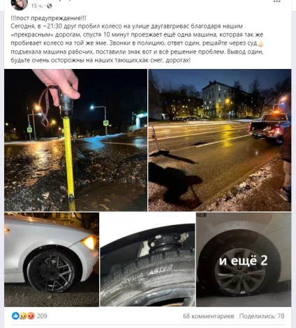 А на днях женщина пожаловалась на совсем уж вопиющий случай. "В ~21:30 друг пробил колесо на улице Даугавгривас благодаря нашим «прекрасным» дорогам. Спустя 10 минут проезжает еще одна машина, которая так же пробивает колесо на той же яме. Звонки в полицию, ответ один - решайте через суд. Подъехала машина рабочих, поставили знак - вот и все решение проблем. Вывод один: будьте очень осторожны на наших тающих как снег дорогах!"