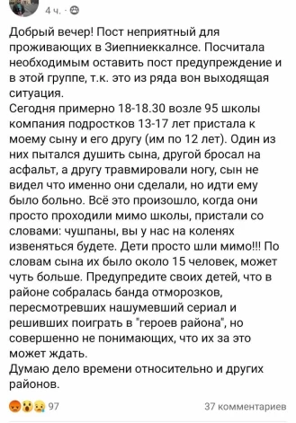 Далее женщина описывает саму ситуацию, с которой многие давно уже не сталкивались: "Сегодня примерно в 18-18.30 возле 95-й школы компания подростков 13-17 лет пристала к моему сыну и его другу (им по 12 лет). Один из них пытался душить сына, другой бросал на асфальт, а другу травмировали ногу. Сын не видел, что именно они сделали, но идти ему было больно. Все это произошло, когда они просто проходили мимо школы, пристали со словами: "Чушпаны, вы у нас на коленях извиняться будете". Дети просто шли мимо!!! По словам сына, их было около 15 человек, может чуть больше".