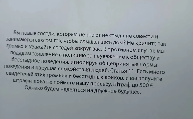 "Не кричите так громко и уважайте соседей вокруг вас. В противном случае мы подадим заявление в полицию за неуважение к обществу и бесстыдное поведение (...) Есть много свидетелей этих громких и бесстыдных криков, и вы получите штрафы, пока не поймете нашу просьбу. Штраф до 500 евро", - угрожают соседке. Но заканчивается письмо на позитивной ноте: "Однако будем надеяться на дружное будущее".