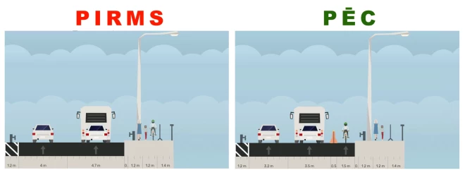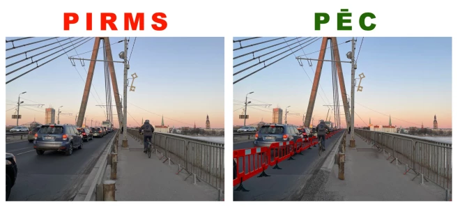 "Призываем Ригу развивать и улучшать ситуацию на тротуаре, пока не поздно! Вантовый мост имеет очень широкие полосы проезжей части, при сужении которых отведенное место можно выделить для временных велополос без изменения количества полос движения. Это можно сделать уже в ближайшие недели, не дожидаясь, когда может начаться ремонт моста", - призывают энтузиасты.