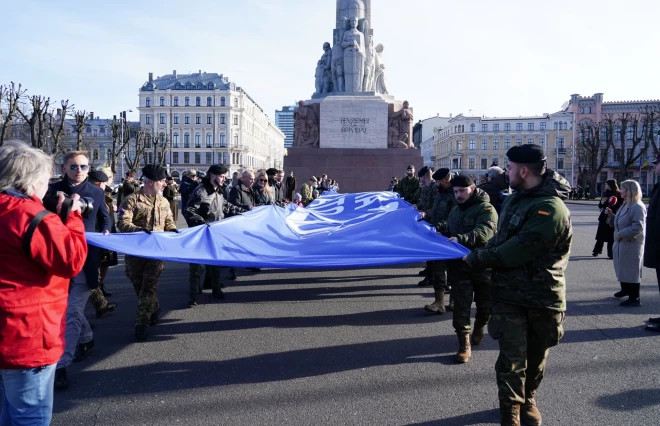 Утром у памятника Свободы состоялось торжественное мероприятие - развертывание большого флага "Латвия НАТО-20", принять участие в котором были приглашены все желающие.
