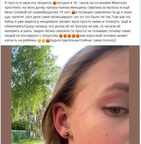 В соцсетях женщина описала ситуацию и приложила фото травмированного ребенка. Она добавила, что написала заявление в полицию. "Да, я знаю, сейчас налетят, мол дети сами провоцируют, но тут это было не так! Эту бабку я уже видела в неадеквате (может идти просто мимо и толкнуть, еще и обматерить). Сразу напишу, что дочка ее не трогала никак, та начала ее материть и хаять - видно, белка схватила! Я просто не понимаю, почему таких людей не изолируют с общества. Как взрослый человек может напасть на ребенка? Будьте бдительны, сейчас таких полно", - возмущена рижанка.
