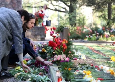 Люди возлагают цветы 9 мая 2023 года у памятника и братского кладбища в Берги.