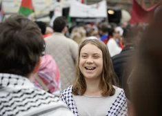 Для участия в демонстрации Тунберг надела кеффию – головной убор, обычно используемый для поддержки Палестины. Во время протеста были пущены дымовые шашки цвета палестинского флага, а протестующие несли плакаты с изображениями жителей Газы, пострадавших в ходе последнего обострения конфликта.