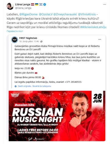 Так, на днях ее внимание привлек факт проведения в одном из рижских клубов в эту пятницу вечеринки под провокационным названием Russian music night. Естественно, г-же Ланге это показалось возмутительным. "Почему во время войны России в Украине в Риге разрешено чествовать русскую культуру? Надеемся на разумное и нравственное регулирование в ближайшем будущем! Рига не должна быть цитаделью русского циничного веселья!" - написала она, обратившись к Рижской думе и лично к мэру.