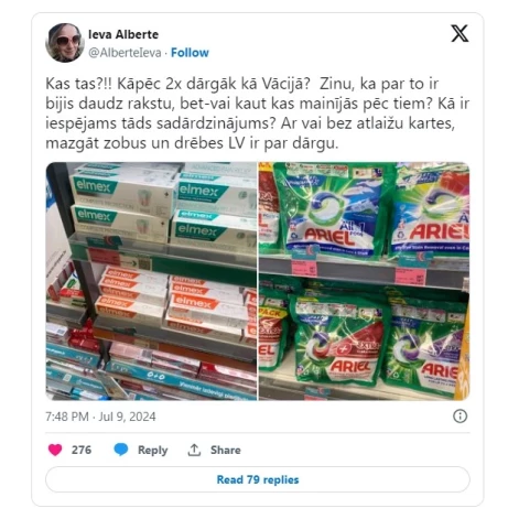 Выразить свое недоумение и разочарование жители Латвии могут только в соцсетях, где им отвечают такие же потребители, у которых тоже нет ответа на вопрос - почему в стране с более низким уровнем жизни товары стоят в разы дороже. Так, одна дама высказала свою горечь после посещения магазина Drogas: "Что это?! Почему в два раза дороже, чем в Германии? Я знаю, что об этом было много статей, но изменилось ли что-нибудь после них? Как возможно такое удорожание? Со скидочной картой или без нее чистить зубы и одежду в Латвии слишком дорого".