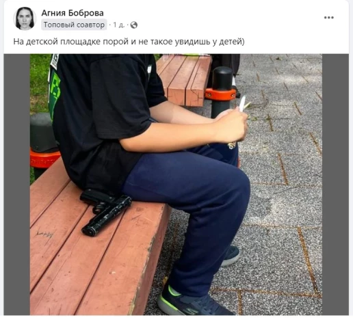 Так, одна жительница рижского микрорайона Пурвциемс поделилась снимком, который сделала на детской площадке. На нем изображен сидящий на скамейке подросток, рядом с которым лежит весьма правдоподобно выглядящий пистолет, а сам мальчик держит в руках еще и нож. "На детской площадке порой и не такое увидишь у детей", - подписала фото автор.