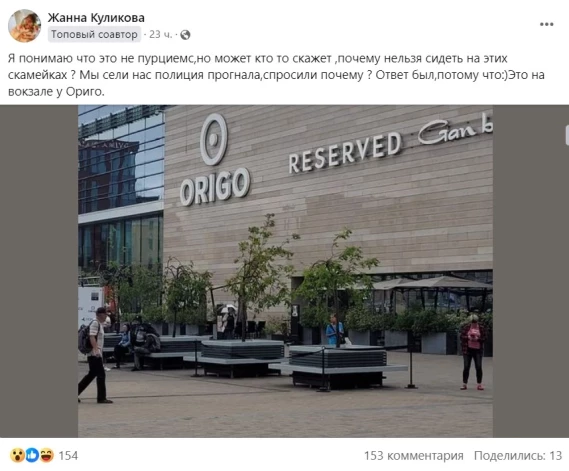 Выйдя из торгового центра Origo на Привокзальную площадь, у кого-то может возникнуть желание присесть, особенно если погода этому благоприятствует. Вот только сделать это не всегда получится: хотя скамейки есть, сидеть на части из них нельзя - они даже огорожены столбиками. И это уже далеко не первый день, так что речь точно не идет о том, что скамейки покрашены. Более того, тех, кто все же садится на эти места, выгоняет полиция. Об этом люди с недоумением пишут в соцсетях: "Может, кто-то скажет, почему нельзя сидеть на этих скамейках? Мы сели - нас полиция прогнала, спросили почему - ответ был "потому что".