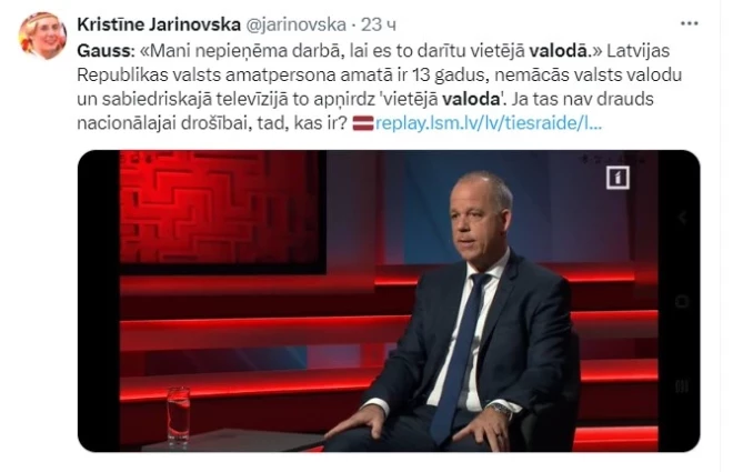Например, представитель Латвийского центра памяти Кристина Яриновска написала: "Государственный чиновник Латвийской Республики находится на своем посту 13 лет, не учит государственный язык и высмеивает «местный язык» на общественном телевидении. Если это не угроза национальной безопасности, то что?". Позже она добавила: "Проблема в том, что чиновник не может выучить государственный язык, не хочет его изучать и безнаказанно издевается над государственным языком. Против этого мы выступали в 1989 году. Точно. Чтобы к Латвии не относились как к колонии".