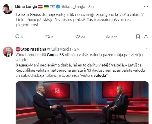Ей вторит Лиана Ланга: "Похоже, что Гаусс имел в виду местный, такой незначительный аборигенный латышский язык? Шовинизм представителей великих наций на практике. Это оскорбительно и неприемлемо!" А ее коллега Марцис Кулис добавляет: "В стиле немецкого барона Гаусс понизил статус официального государственного языка ЕС до "местного языка".