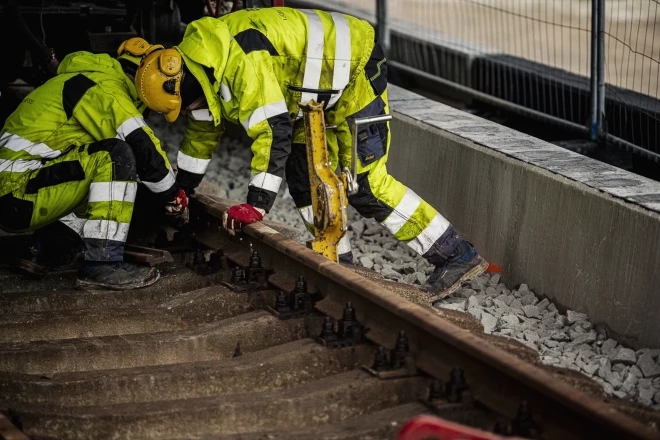 На недавно построенной части станции Rail Baltica в Риге сейчас проходят работы по укладке путей. Укладываются рельсы шириной 1520 мм в качестве временного решения, чтобы, когда южная часть станции будет введена в эксплуатацию, можно было перенаправить туда движение существующих поездов и обслуживание пассажиров, продолжая строительные работы на северной стороне.