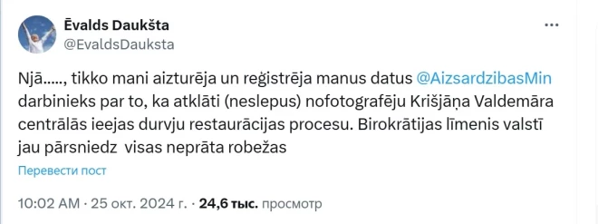 О том, что просто так фотографировать вход в оборонное министерство нашей страны не стоит, рассказал пользователь в соцсетях. Вот что он пишет: "Да, ситуация... Меня только что задержал и зарегистрировал мои данные сотрудник Министерства обороны за то, что я открыто (не скрытно) сфотографировал процесс реставрации центральных дверей на Кришьяня Валдемара. Бюрократия в стране уже давно выходит за все границы разумного".