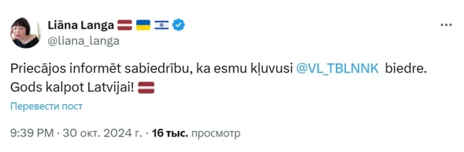 Видимо, это время пришло - Лиана Ланга в соцсетях сообщила, что стала членом Национального объединения. По любытному совпадению это произошло в один день с новостью о том, что в Риге демонтировали памятник Барклаю де Толли. Оба эти события Ланга осветила в своих соцсетях. По поводу свеже приобретенной партийной принадлежности она написала: "Рада сообщить общественности, что я стала членом Национального объединения. Честь служить Латвии!"