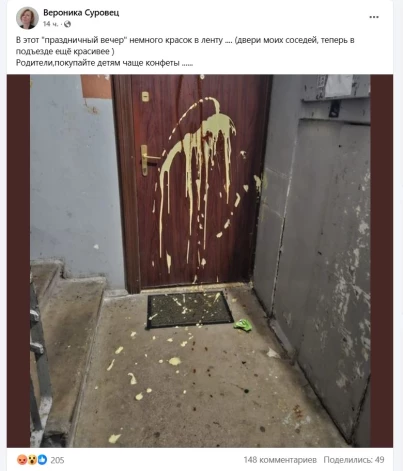 Неужели это действительно так? К сожалению, приходится констатировать, что поведение детей порой нельзя назвать хорошим. В соцсетях уже появляются доказательство того, что некоторые латвийцы пострадали от действий недовольных подростков. Так, жительница Саласпилса поделилась фотографией, на которой изображена входная дверь, испачканная, судя по всему, майонезом. "В этот "праздничный вечер" немного красок в ленту... (двери моих соседей, теперь в подъезде еще красивее). Родители, покупайте детям чаще конфеты..." - пишет негодующая женщина.