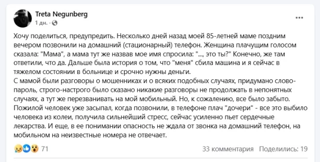 "Несколько дней назад моей 85-летней маме поздним вечером позвонили на домашний (стационарный) телефон. Женщина плачущим голосом сказала: "Мама", а мама, сразу назвав мое имя, спросила: *****, это ты?' Конечно же, на том конце ответили, что да. Далее последовала история о том, что "меня" сбила машина, и я сейчас в тяжелом состоянии в больнице, срочно нужны деньги", — рассказала женщина. К счастью, она заранее предупреждала свою мать о подобных преступлениях, однако, увы, это сработало не до конца. "С мамой были разговоры о мошенниках и подобных случаях, мы придумали кодовое слово, я строго-настрого сказала не продолжать никакие разговоры в подобных ситуациях и сразу перезванивать мне на мобильный. Но, к сожалению, все было забыто. Пожилой человек уже засыпал, когда позвонили, услышала плач "дочери" — все это выбило ее из колеи, она испытала сильный стресс и теперь усиленно пьет сердечные лекарства".