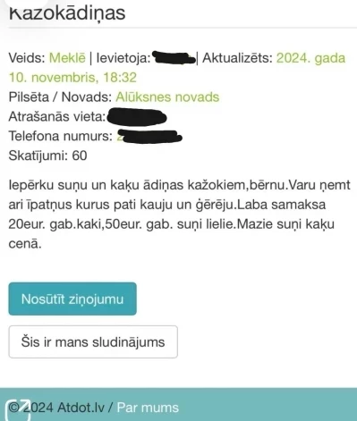 Как видно из объявления, автор объявления указал, что находится в Алоксненском крае. В Государственной полиции подтвердили, что заявление получено в Видземском региональном управлении, и в настоящее время проводится проверка материалов.