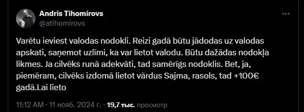 Предложение звучит так: "Можно было бы ввести налог на язык. Раз в год нужно было бы проходить языковую проверку, получая наклейку, подтверждающую право использовать язык. Были бы разные ставки налога. Если человек говорит адекватно, налог умеренный. Но если, например, человек использует слова вроде Sajma или rasols, то +100€ в год. Пусть пользуются!" Также автор добавил, что это повысит ценность латышского языка: "Буквально. Возможно, это привлечет новых пользователей языка".