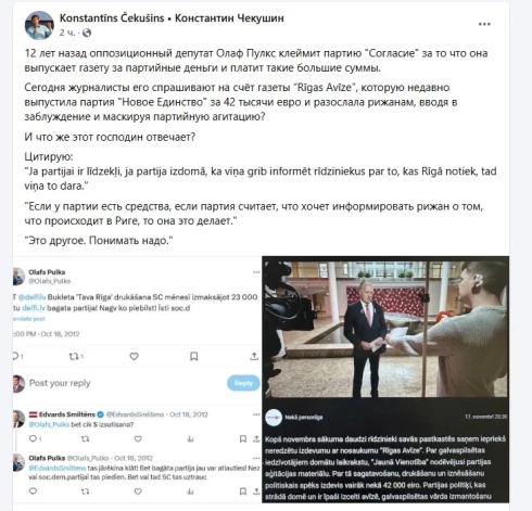 Интересно, что 12 лет назад, когда Ригой руководил представитель партии "Согласие" Нил Ушаков, выпуск подобной "партийной" газеты под названием Tava Rīga вызвал критику у представителей других партий. Об этом в соцсетях пишет депутат Рижской думы Константин Чекушин: "12 лет назад оппозиционный депутат Олаф Пулкс клеймит партию "Согласие" за то, что она выпускает газету за партийные деньги и платит такие большие суммы. Сегодня журналисты его спрашивают насчет газеты Rīgas Avīze, которую недавно выпустила партия "Новое Единство" за 42 тысячи евро и разослала рижанам, вводя в заблуждение и маскируя партийную агитацию? И что же этот господин отвечает? Цитирую: "Если у партии есть средства, если партия считает, что хочет информировать рижан о том, что происходит в Риге, то она это делает. Это другое. Понимать надо".