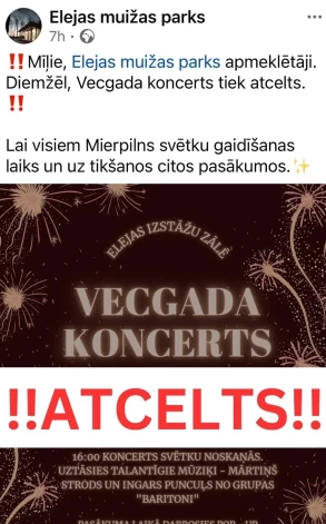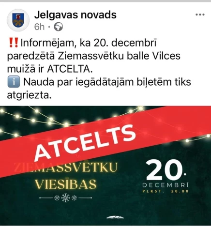 Жители Елгавского края столкнулись с печальной новостью — за месяц было получено три объявления об отмененных мероприятиях. Речь идет о концерте певицы Jenny May в Лиелплатоне 15 декабря, Рождественском бале в Вилце 20 декабря, а также о новогоднем концерте в парке усадьбы Элея.