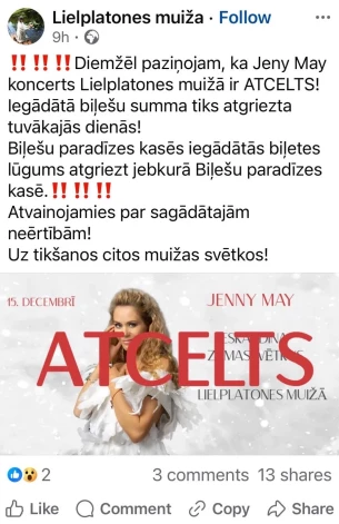Как объяснила порталу Jauns.lv руководитель отдела общественных отношений Елгавского самоуправления Лелде Подниеце-Йостмане, в настоящее время идет активная работа по разработке плана сокращения расходов самоуправления, каждому направлению поручено пересмотреть свои расходы. Учитывая расходы на мероприятия и прогнозируемые доходы от продажи билетов, некоторые мероприятия были отменены — Рождественское мероприятие в Вилце, концерты в выставочном зале Элея и в Лиелплатоне. "Вход на запланированное мероприятие в выставочном зале Элея должен был быть за пожертвования. На другие два мероприятия билеты можно было приобрести в Biļešu paradīze. Возврат денег за отмененные мероприятия обеспечивает Biļešu paradīze. Билеты, купленные в торговых точках, можно вернуть в торговых точках Biļešu paradīze", - объясняет Подниеце-Йостмане.
