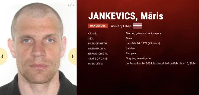 Марис Янкевич разыскивается по подозрению в особо жестоком убийстве женщины в Сабиле, совершенном весной 2022 года. Подозреваемый, находясь в состоянии алкогольного опьянения, убил женщину несколькими ударами ножом, душил ее и поджег.