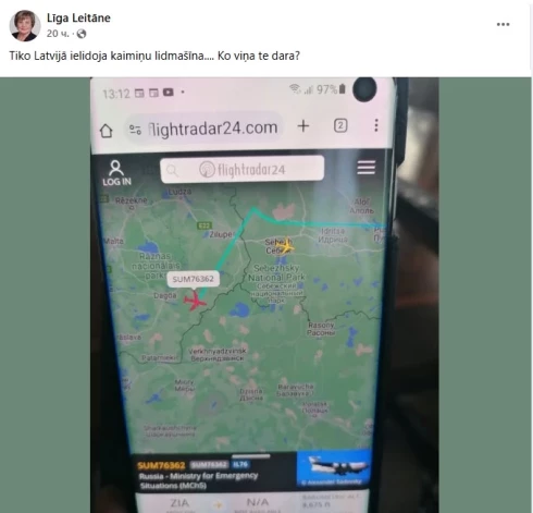 На платформе Facebook Лига Лейтане, экономист, финансист, предприниматель и финансовый консультант, опубликовала фото с сайта flightradar24.com, на котором видно, как над территорией Латвии пролетает самолет МЧС России. Лейтане написала: "Только что в Латвию залетел самолет соседей... Что он здесь делает?"